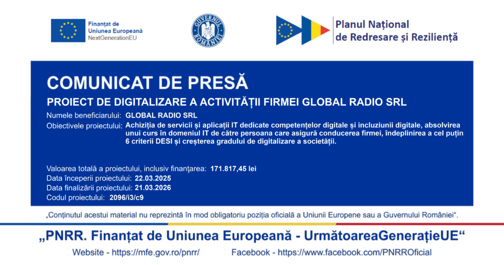 GLOBAL RADIO SRL, cod de identificare fiscală RO 37562776, înregistrată la Registrul Comerțului sub nr. J33/800/2017, cu sediul în Mun. Suceava, Str. Mărăşti nr. 18, tronson 2, bl. 3, etaj 1, ap. 2, Jud. Suceava, a implementat în perioada 22.03.2025 – 21.03.2026 proiectul nr. 2096/i3/c9, intitulat: ”DIGITALIZAREA ACTIVITĂȚII FIRMEI GLOBAL RADIO SRL”, finanțat prin Planul Național de Redresare și Reziliență, Componenta C9 „Suport pentru sectorul privat, cercetare, dezvoltare și inovare”, Investiția I3 „Scheme de ajutor pentru sectorul privat”, Măsura 1 „Schemă de minimis și schemă de ajutor de stat în contextul digitalizării IMM-urilor”, Apel 1 „Digitalizarea IMM-urilor grant de până la 100.000 euro pe întreprindere care să sprijine IMM-urile în adoptarea tehnologiilor digitale”.